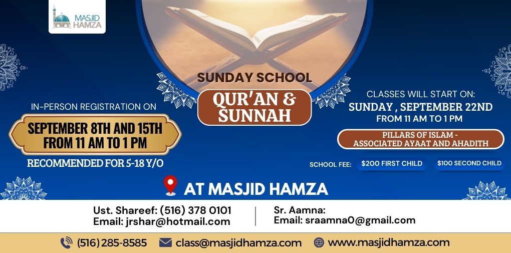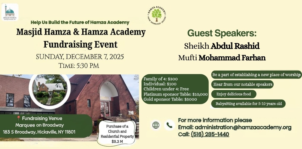 Masjid Hamza is a 501(c) religious organization in Valley Stream, NY – a community of believers adhering to the Qur’an and the sunnah of the Prophet Muhammad (Peace and Blessing Be Upon Him).